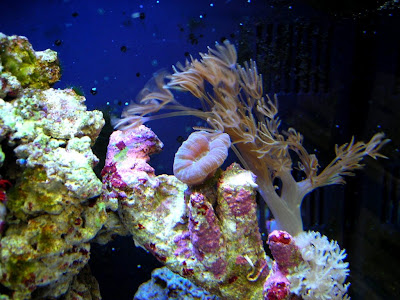 My corals are doing ok, the Candy Cane coral is looking a little sad today but Saturday night it had its feeders out full force to the point where it looked like a little anemone. I have it anchored near the top, about 4 inches from the surface. The Zoas are doing great, they open up all the way now and seem fairly happy. The SPS is still doing fine where I put it a few days ago. The Galaxy coral is off by itself and is still rather small but I don't want to risk it stinging any other nearby corals because those can stretch further than you'd think. I added a turbo snail last week and it has been doing much better than expected in getting rid of that hairy algae, most of it is gone!
